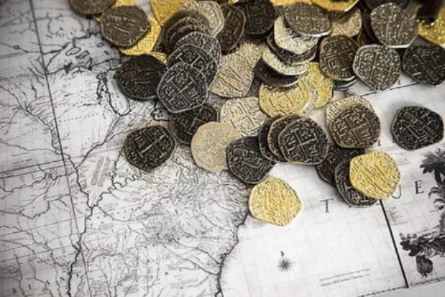 Originale Nachprägungen von Piratenmünzen aus Metall.